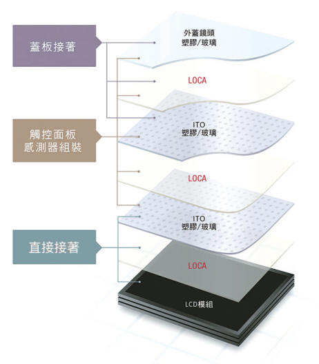 液態透明光學膠(Liquid Optical Clear Adhesive;LOCA/Optical Clear Resin;OCR)的功用,主要是用於透明光學元件黏合的特殊黏著劑,液態透明光學膠可完全貼合觸控面板與玻璃保護層之間的空隙,讓兩層板完全密合,沒有任何縫隙與空氣層,使得顯示面板的背光較順利穿透玻璃表面,不會受外部光照與背光影響,產生光散射疊影。